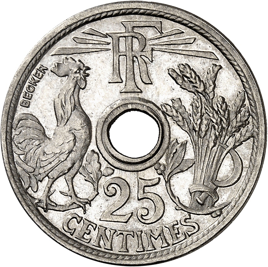 Av. RF/ 25/ CENTIMES. Un coq à gauche et une gerbe à droite de la perforation centrale ; signature BECKER.