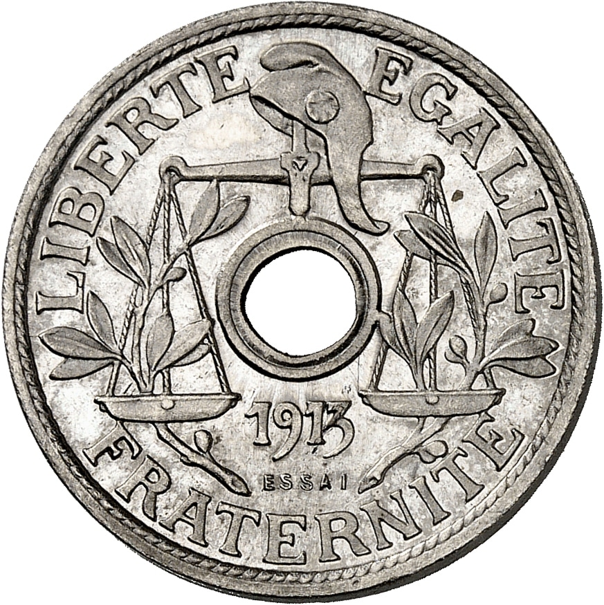 - IIIe République (1870-1940). Essai de 25 centimes, concours de 1913, 1er type, grand module, par Becker, Frappe spéciale (SP) 1913, Paris.
