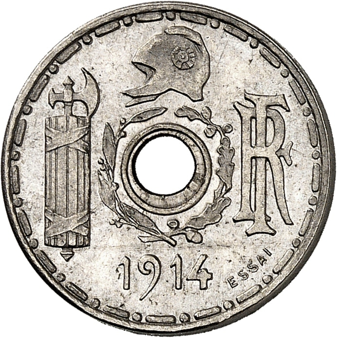 Av. Autour de la perforation centrale, petite couronne formée de deux branches et faisceau à gauche, bonnet de la Liberté au-dessus, RF en monogramme à droite et (date) au-dessous ; au-dessous ESSAI.
