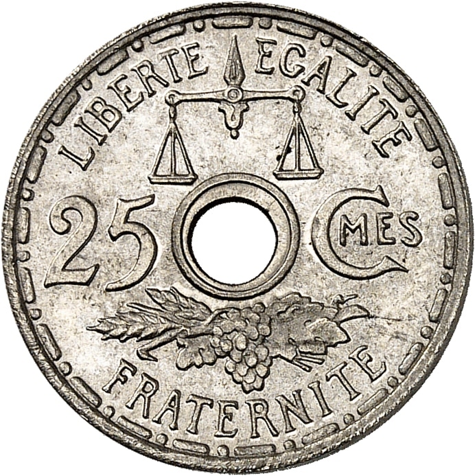 Rv. LIBERTE - EGALITE / FRATERNITE. Autour de la perforation centrale, 25 à gauche, une balance au-dessus, CMES à droite, une grappe de raison et des épis au-dessous.