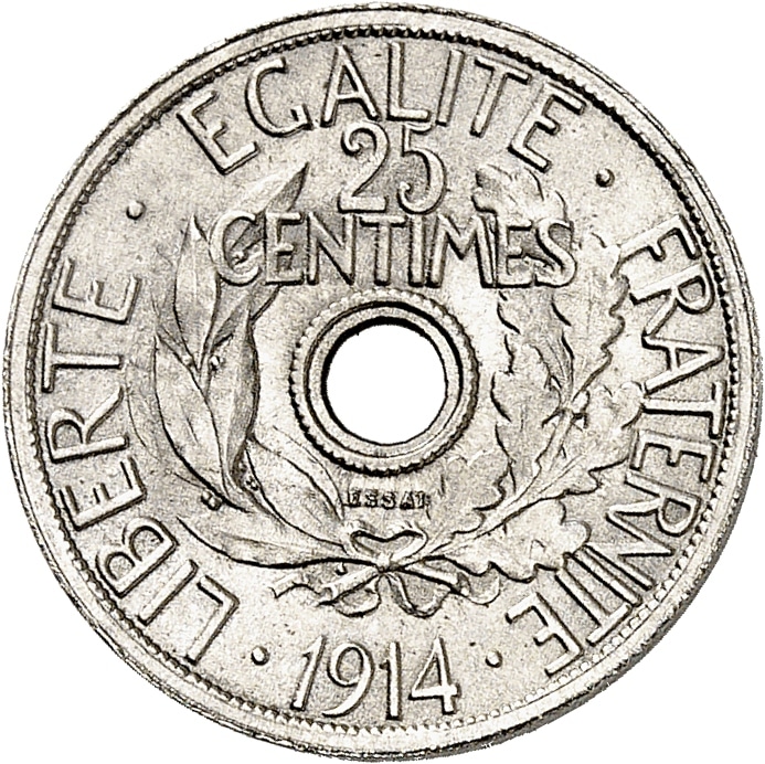 Rv. LIBERTÉ. ÉGALITÉ. FRATERNITÉ. Perforation ronde centrale dans une couronne formée d’une branche de chêne et d’une branche de laurier, au-dessus 25 / CENTIMES et au-dessous ESSAI ; à l’exergue (date).