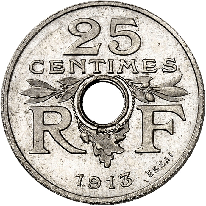 - IIIe République (1870-1940). Essai de 25 centimes, concours de 1913, petit module, par Guis, Frappe spéciale (SP) 1913, Paris.