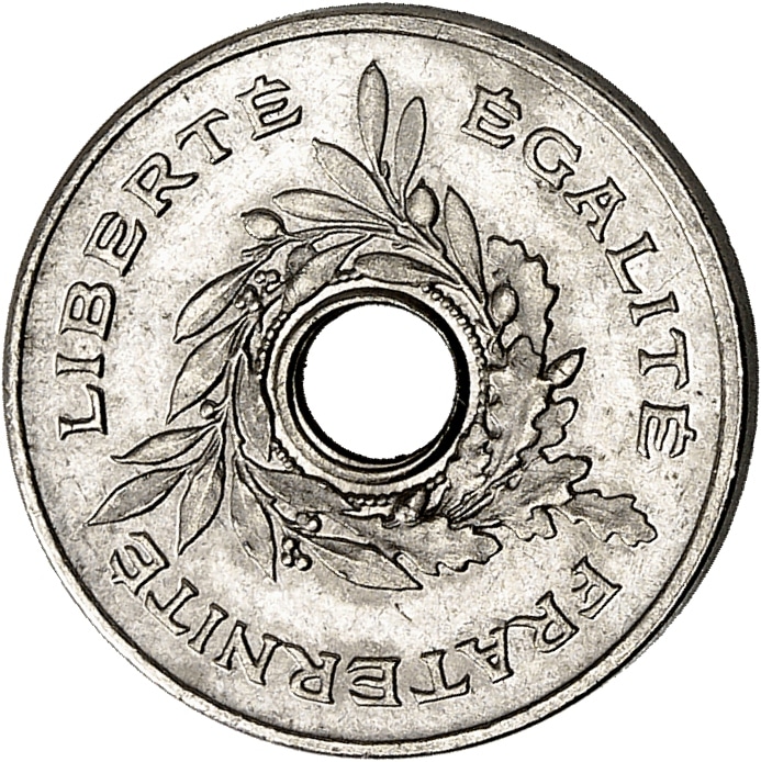Av. (à 6 h) LIBERTÉ ÉGALITÉ FRATERNITÉ. Autour de la perforation ronde centrale, couronne formée de branches de laurier, de chêne et d’olivier.