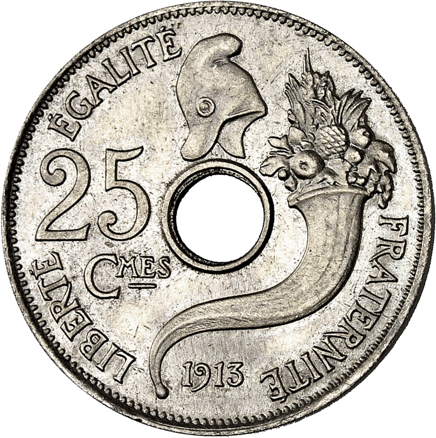 Rv. LIBERTÉ - ÉGALITÉ - FRATERNITÉ. Autour de la perforation ronde centrale, 25 / Cmes à gauche, un bonnet de la Liberté au-dessus et une corne d’abondance au-dessous et à droite ; (date) sous la corne.