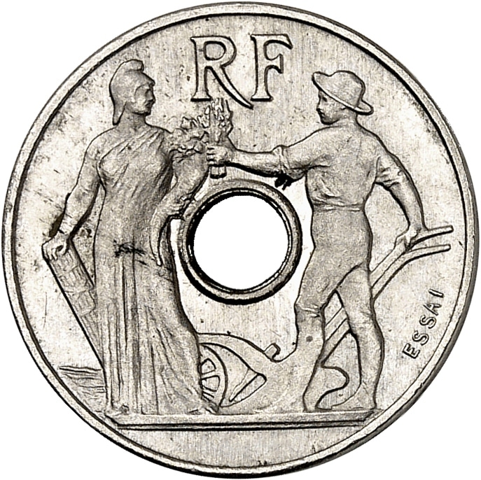 Av. RF. Un laboureur appuyé sur une charrue, donnant une gerbe d’épis à la République, avec corne d’abondance et faisceau ; ESSAI à droite.