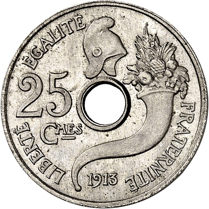 Rv. LIBERTÉ - ÉGALITÉ - FRATERNITÉ. Autour de la perforation ronde centrale, 25 / Cmes à gauche, un bonnet de la Liberté au-dessus et une corne d’abondance au-dessous et à droite ; (date) sous la corne.