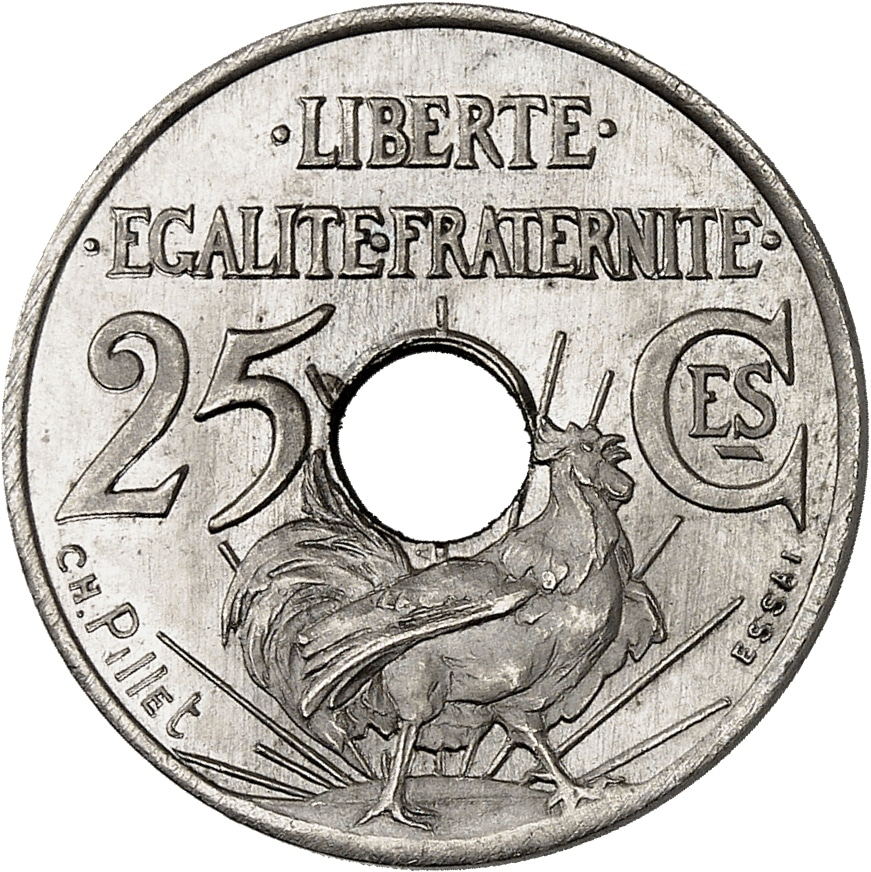 Rv. .LIBERTE. / .EGALITE. .FRATERNITE. Autour de la perforation ronde centrale : 25 à gauche et Ces à droite, avec un coq à droite sur un soleil rayonnant au-dessous ; à l’exergue signature CH. PILLET et ESSAI.