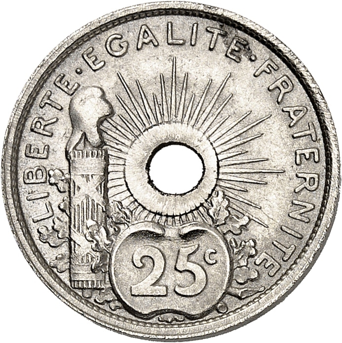 Rv. LIBERTE. EGALITE. FRATERNITE. Autour de la perforation ronde centrale, rayonnante : un faisceau surmonté du bonnet de la Liberté à gauche, une branche de chêne et un cartouche inscrit 25 C.