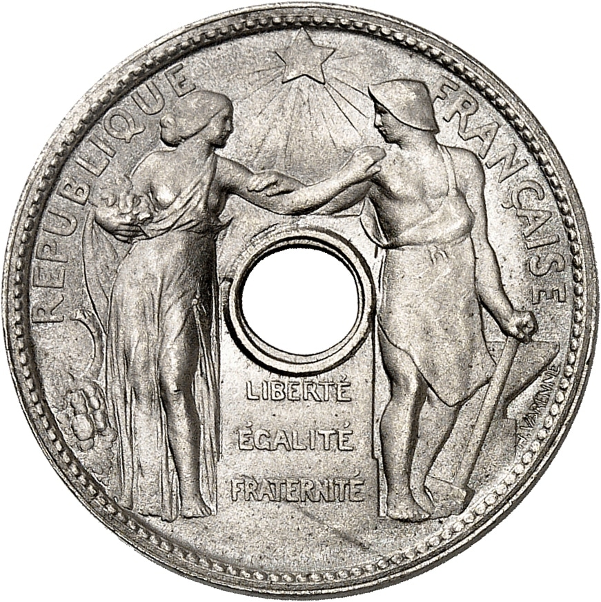 Av. REPUBLIQUE - FRANÇAISE. Autour de la perforation ronde centrale, et sous une étoile rayonnante, Allégorie féminine de l'Agriculture à gauche donnant l'accolade à un Homme représentant l'Industrie à droite. Sous la perforation : LIBERTÉ / ÉGALITÉ / FRATERNITÉ ; signature H. VARENNE.