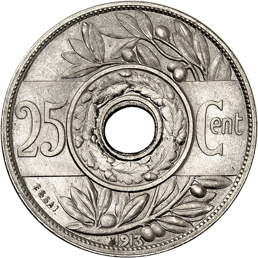 Rv. Sur une branche d’olivier, une bande centrale ornée de 25 - Cent autour de la perforation ronde centrale ; couronne de chêne autour de la perforation ; (date) à l’exergue ; en bas à gauche, ESSAI.