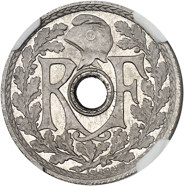 Av. RF autour du trou central surmonté d’un bonnet phrygien, le tout dans une couronne formée de deux branches, signature EM. LINDAUER.
