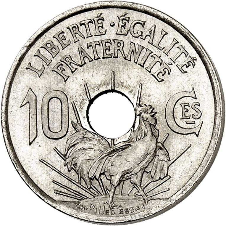 Rv. LIBERTÉ. ÉGALITÉ / FRATERNITÉ. Autour de la perforation ronde centrale : 10 à gauche et Ces à droite, avec un coq à droite sur un soleil rayonnant au-dessous ; à l’exergue signature CH. PILLET et ESSAI.