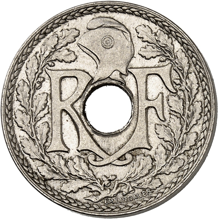Av. RF autour du trou central surmonté d’un bonnet phrygien, le tout dans une couronne formée de deux branches, signature EM. LINDAUER.