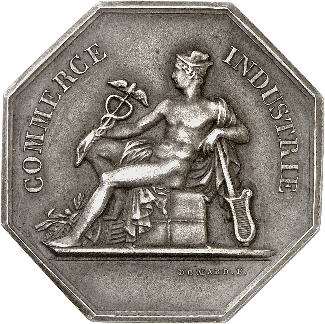 Av. COMMERCE - INDUSTRIE. Mercure assis à gauche sur un ballot, appuyé sur un gouvernail et tenant le caducée, une corne d’abondance à ses pieds ; signature DOMARD F.