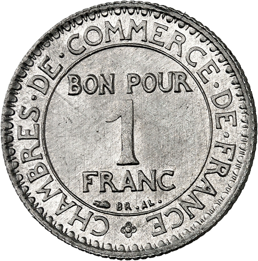 Rv. * CHAMBRES. DE. COMMERCE. DE. FRANCE. Au centre : BON POUR 1 FRANC ; au-dessous (différent) et BR. AL.