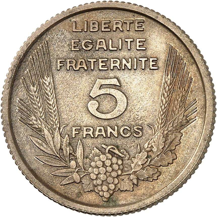 Rv. LIBERTE / EGALITE / FRATERNITE. Dans une couronne composite formée d’une branche de laurier et d’une branche de chêne, avec des épis, olives et grappe de raisin centrale : 5 / FRANCS.