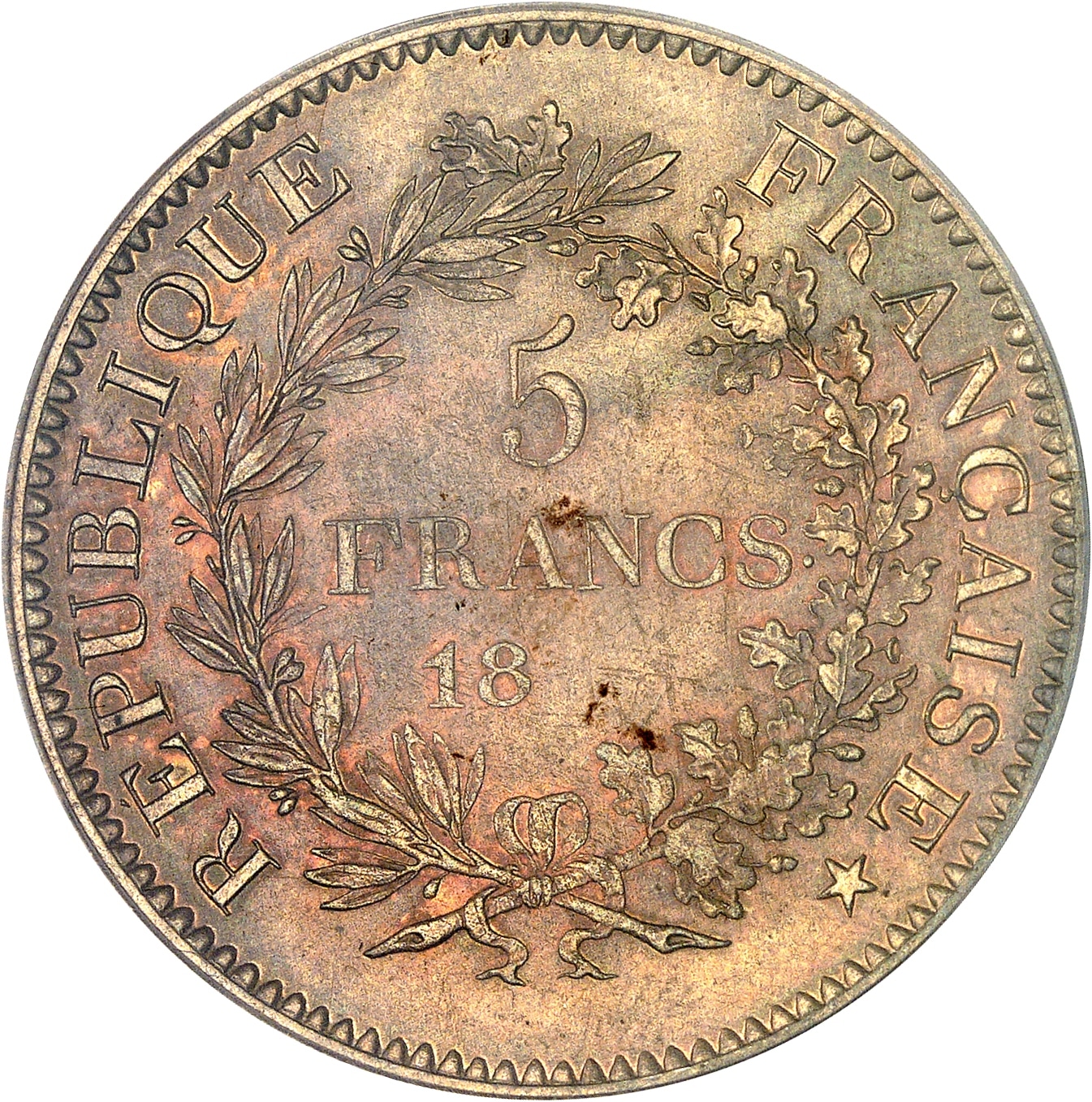 Rv. RÉPUBLIQUE - FRANÇAISE *. Dans une couronne formée d’une branche d’olivier et d’une branche de chêne : 5 FRANCS et 18-- (sans différents, ni atelier).