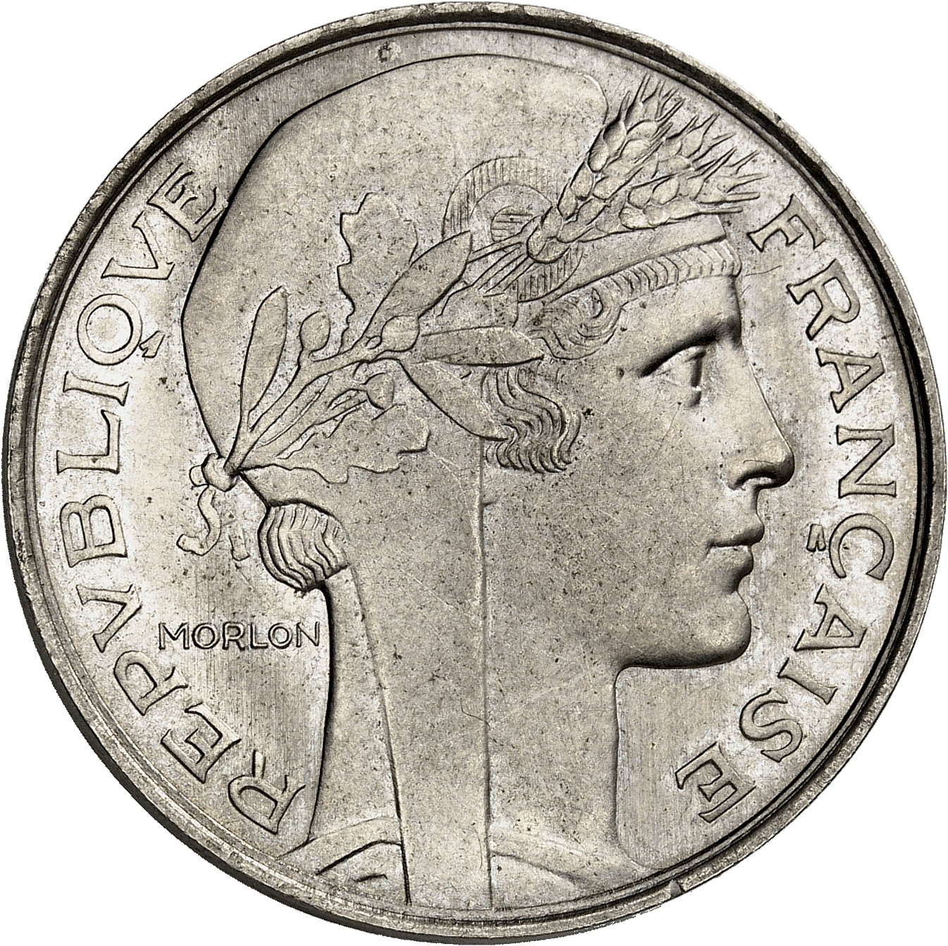Av. REPVBLIQVE - FRANÇAISE. Tête laurée à droite de la République, derrière signature MORLON.
