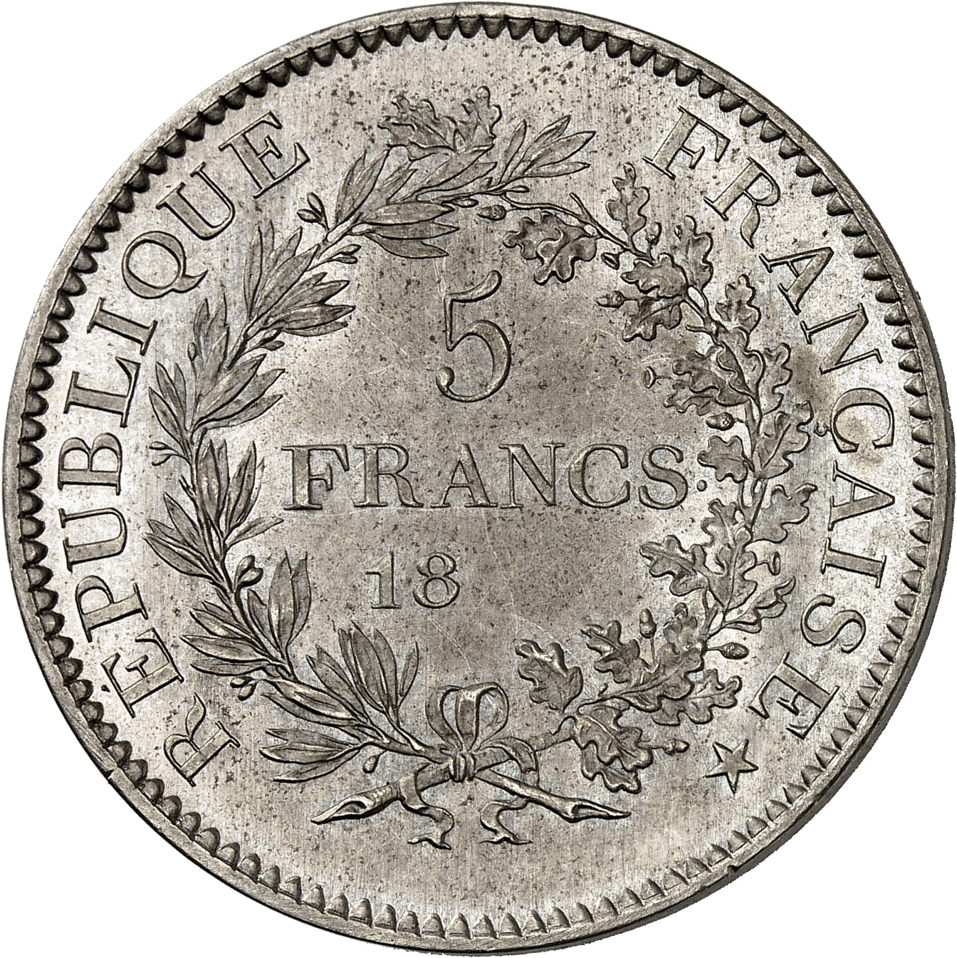 Rv. RÉPUBLIQUE - FRANÇAISE *. Dans une couronne formée d’une branche d’olivier et d’une branche de chêne : 5 FRANCS et 18-- (sans différents, ni atelier).