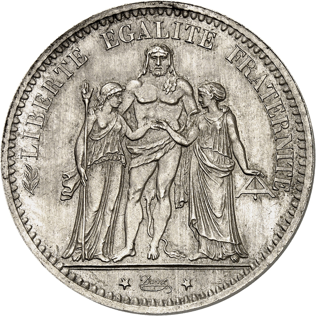 Av. LIBERTÉ ÉGALITÉ FRATERNITÉ. Hercule debout de face avec la léonté, unissant la Liberté debout à gauche tenant une pique surmontée d’un bonnet phrygien, et l’Égalité debout à droite, tenant le niveau. À l’exergue signature cursive Dupré.