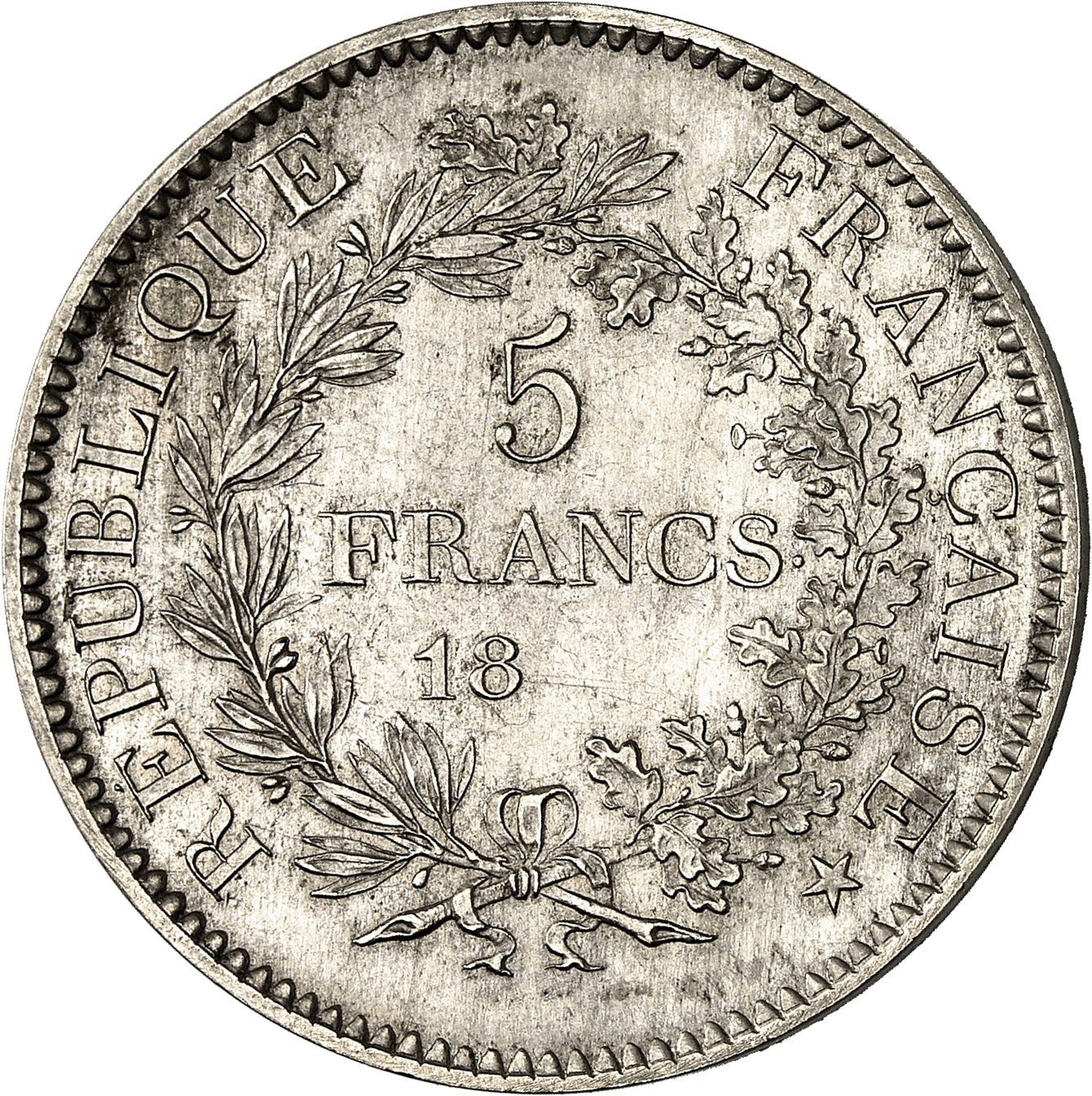 Rv. RÉPUBLIQUE FRANÇAISE *. Dans une couronne formée d’une branche d’olivier et d’une branche de chêne : 5 FRANCS et 18-- (sans différents, ni atelier).