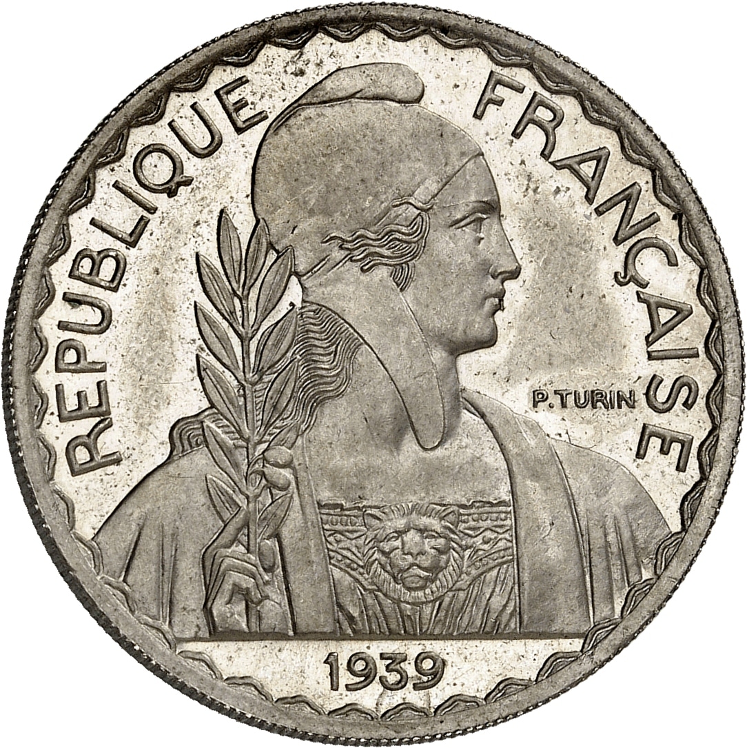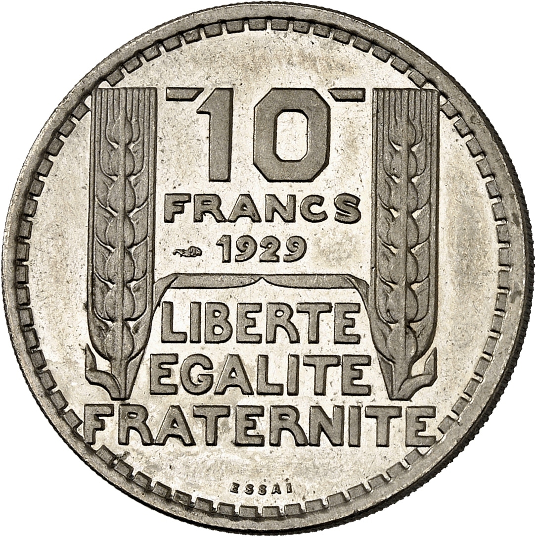 - IIIe République (1870-1940). Essai de 10 francs Turin hybride 30 mm et poids 14 g, Frappe spéciale (SP) 1929-1939, Paris.