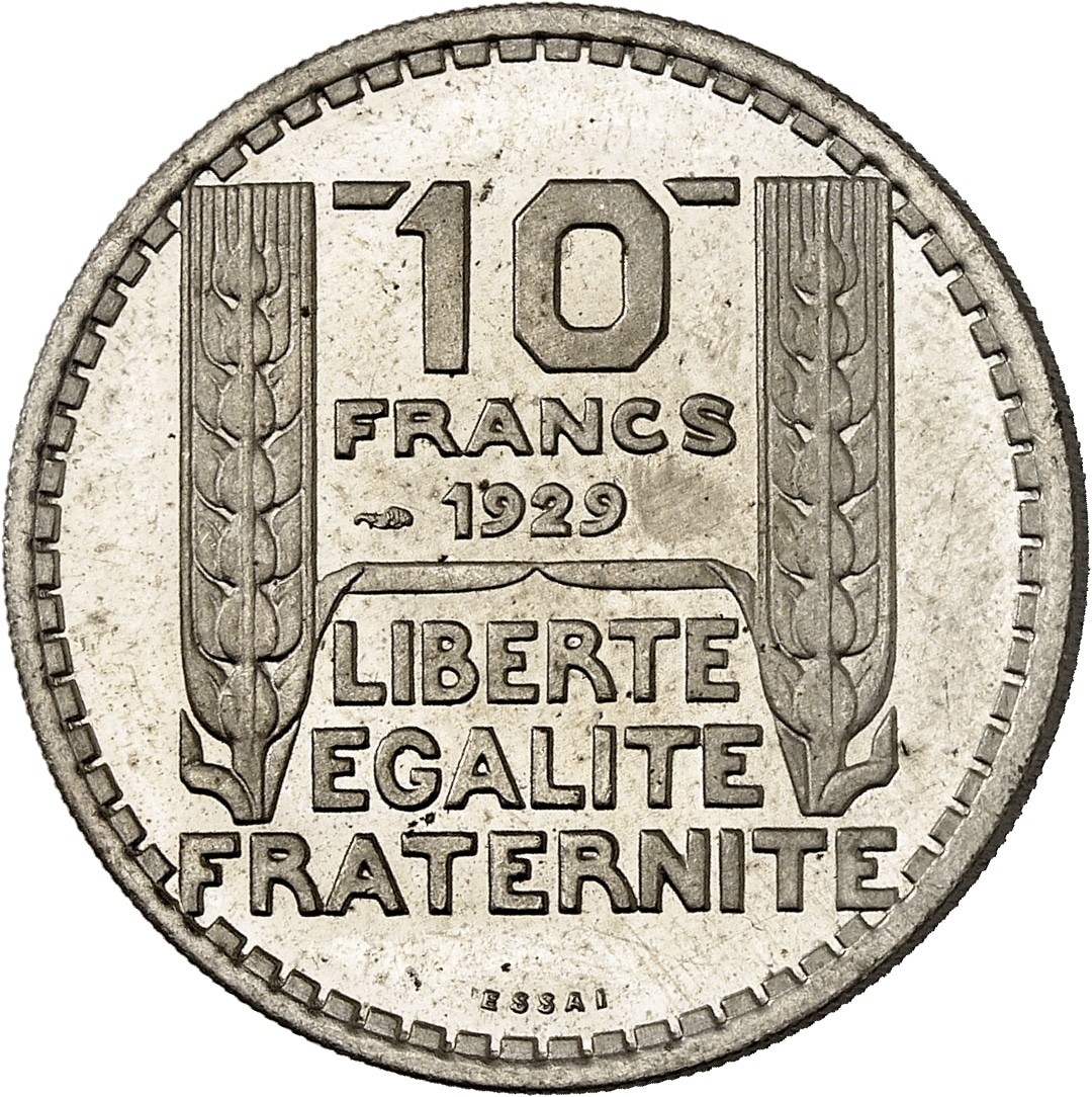 - IIIe République (1870-1940). Essai de 10 francs Turin hybride 30 mm et poids 13 g, Frappe spéciale (SP) 1929-1939, Paris.