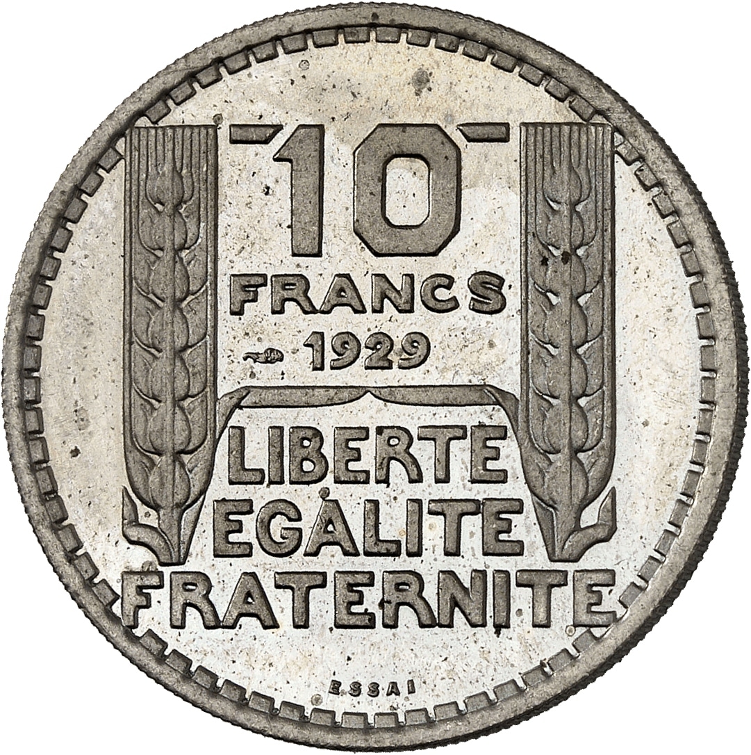 - IIIe République (1870-1940). Essai de 10 francs Turin hybride 30 mm et poids 12 g, Frappe spéciale (SP) 1929-1939, Paris.