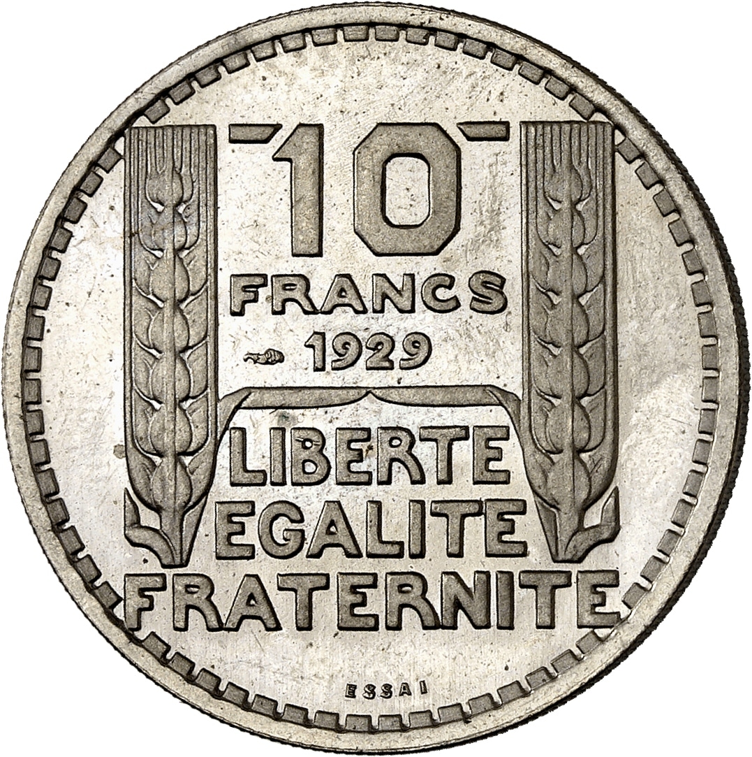 - IIIe République (1870-1940). Essai de 10 francs Turin hybride 30 mm et poids 10 g, Frappe spéciale (SP) 1929-1939, Paris.