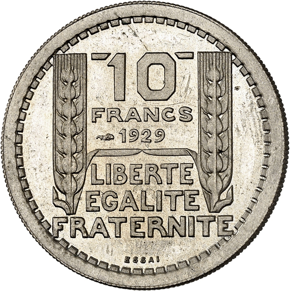 - IIIe République (1870-1940). Essai de 10 francs Turin hybride 26 mm et poids 7,5 g, Frappe spéciale (SP) 1929-1939, Paris.