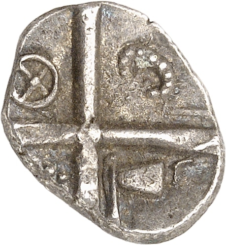 Rv. Croix non bouletée formant quatre cantons : une roue à quatre rayons au 1, un torque au 2, un torque perlé au 3 et une hache verticale au 4.