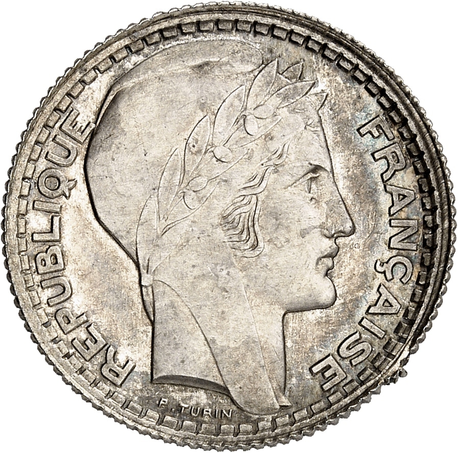 - IIIe République (1870-1940). Épreuve uniface d’avers de 5 francs Turin, en argent, Frappe spéciale (SP) ND (1933), Paris.