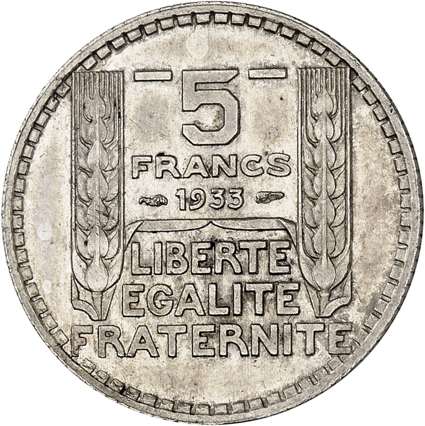 - IIIe République (1870-1940). Épreuve uniface de revers de 5 francs Turin, en argent, Frappe spéciale (SP) 1933, Paris.