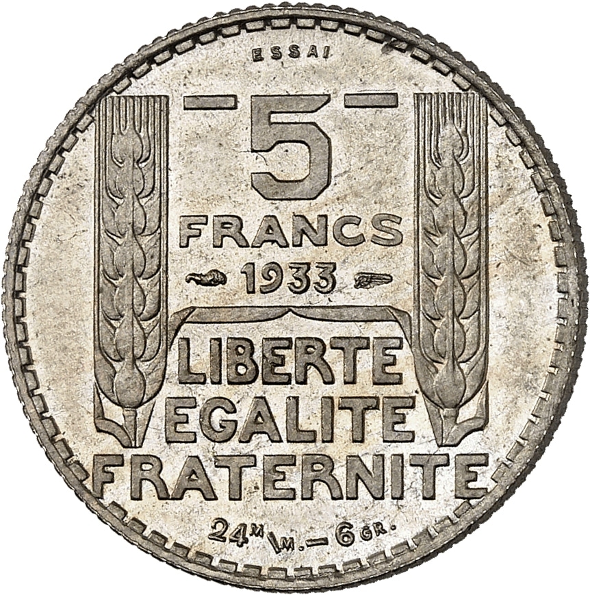 - IIIe République (1870-1940). Essai de 5 francs Turin en cupro-nickel (24 M/M - 6 GR), Frappe spéciale (SP) 1933, Paris.