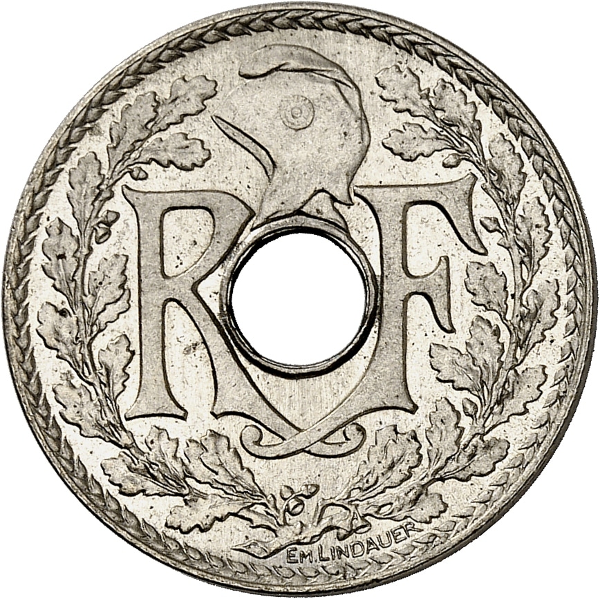 Av. R - F autour de la perforation ronde centrale, surmontée d’un bonnet phrygien, le tout dans une couronne formée de deux branches de chêne ; signature EM. LINDAUER.