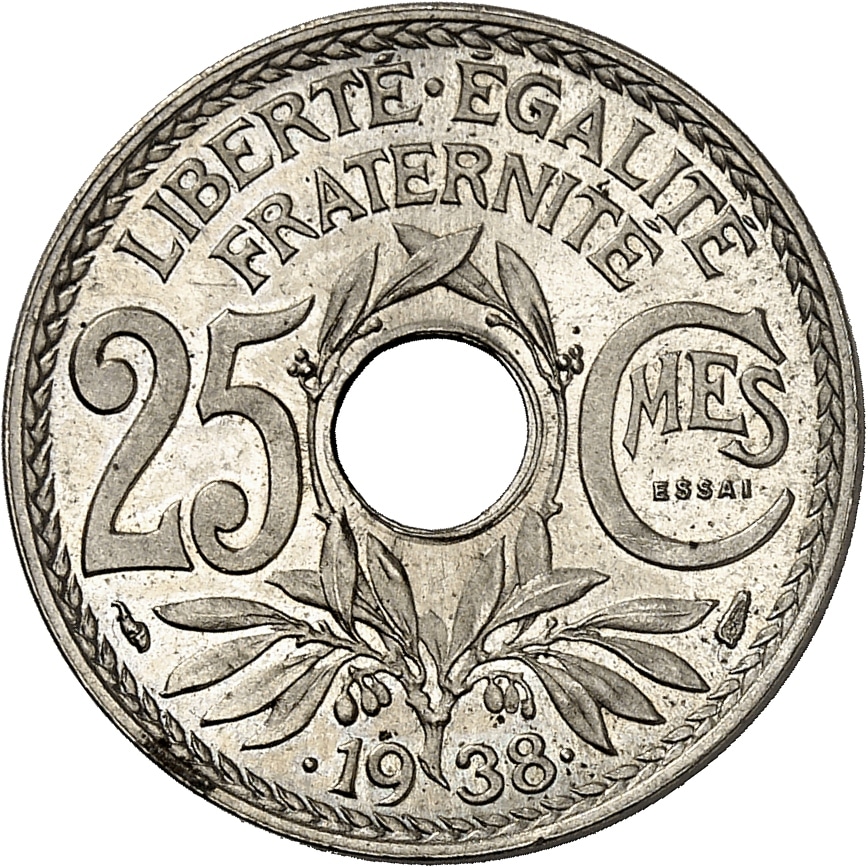 - IIIe République (1870-1940). Essai de 25 centimes, date avec points, par Lindauer, en maillechort, Frappe spéciale (SP) 1938, Paris.