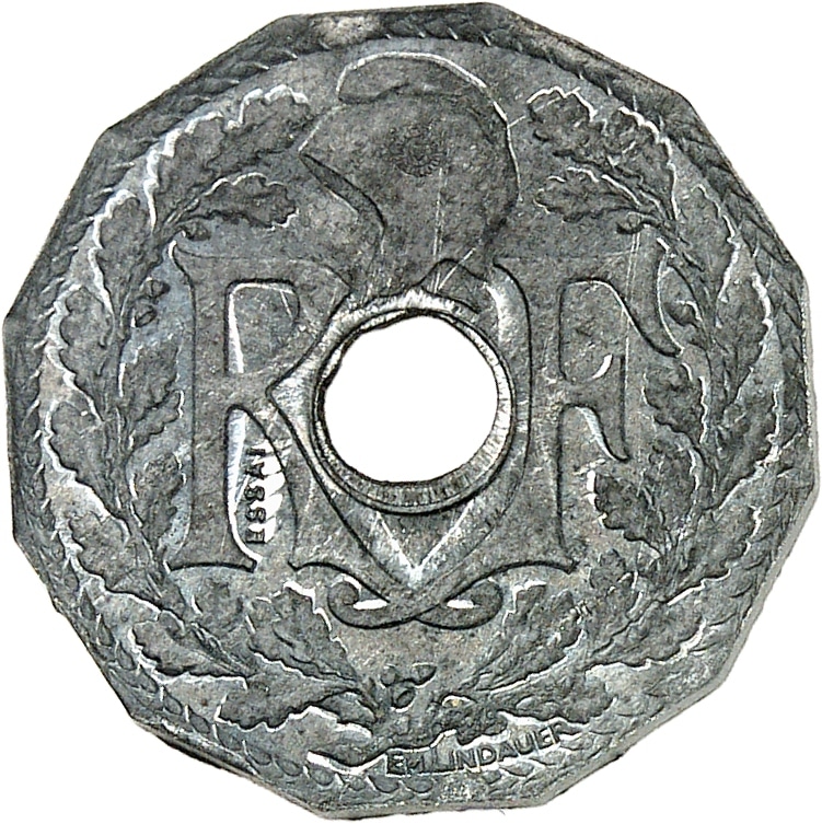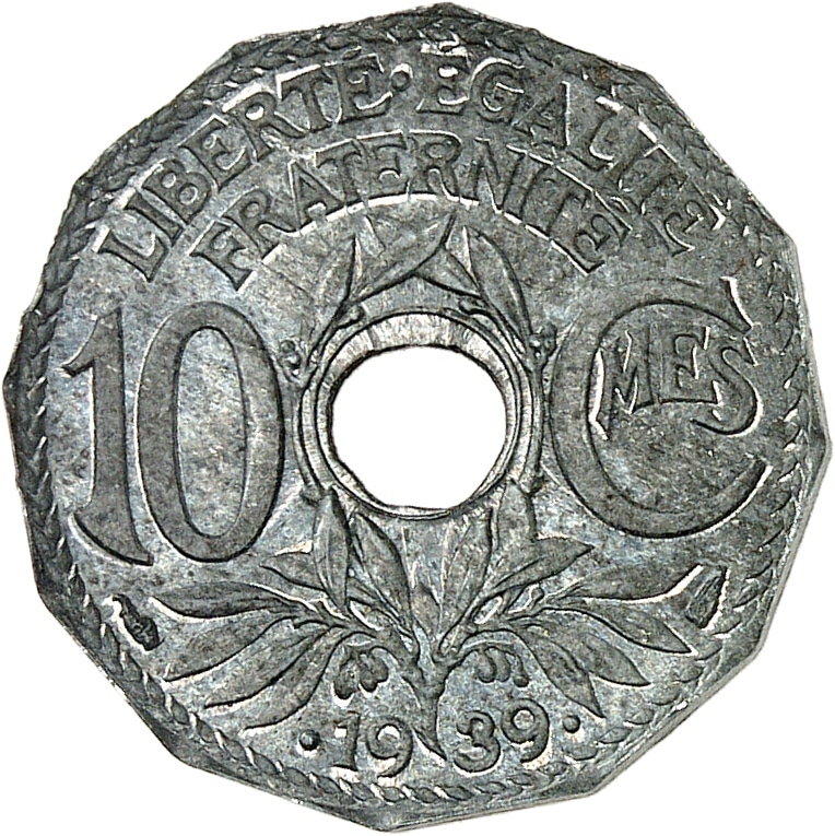 - IIIe République (1870-1940). Essai de 10 centimes Lindauer, dodécagonal, date avec points, en zinc, Frappe spéciale (SP) 1939, Paris.