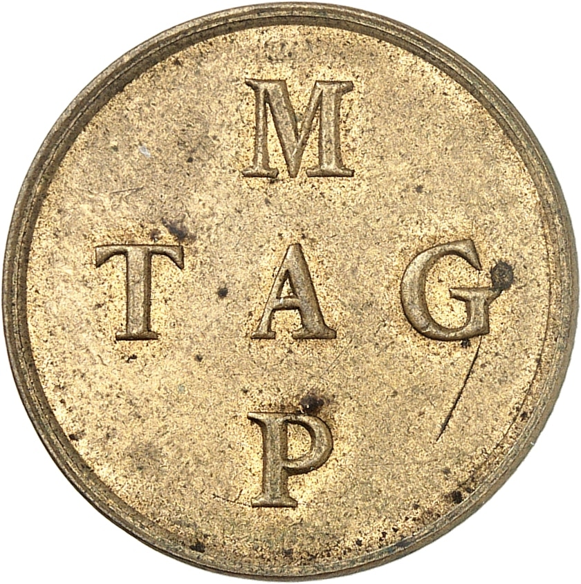 - IIIe République (1870-1940). Essai de presse uniface d’avers pour jetons-monnaies, au module de 1 franc, TAG MAP, tranche striée (en partie), Frappe spéciale (SP) 1922, Poissy.