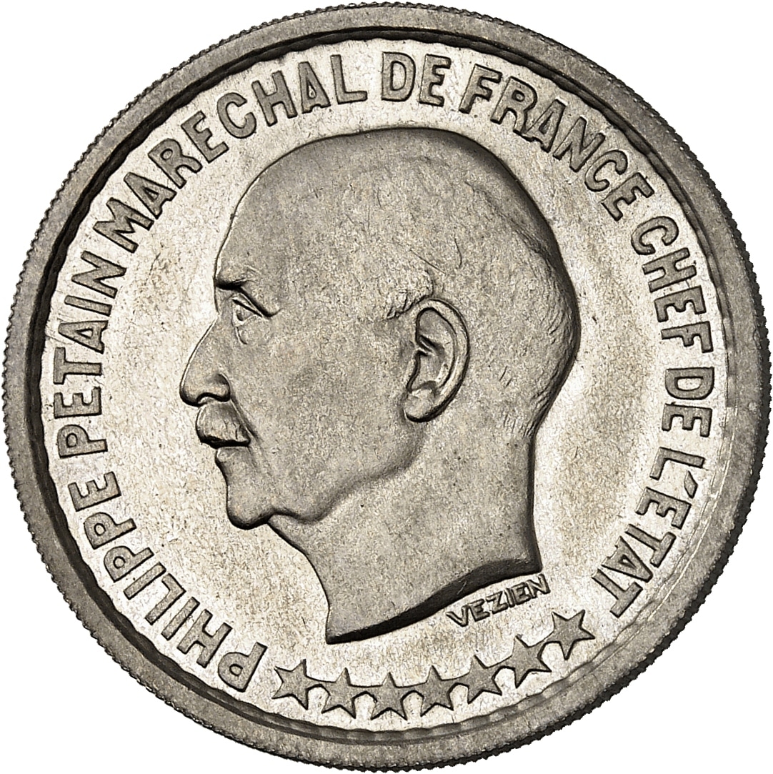 Av. PHILIPPE PETAIN MARECHAL DE FRANCE CHEF DE L’ETAT. Tête nue à gauche de Philippe Pétain ; au-dessous signature VEZIEN et sept étoiles de maréchal.
