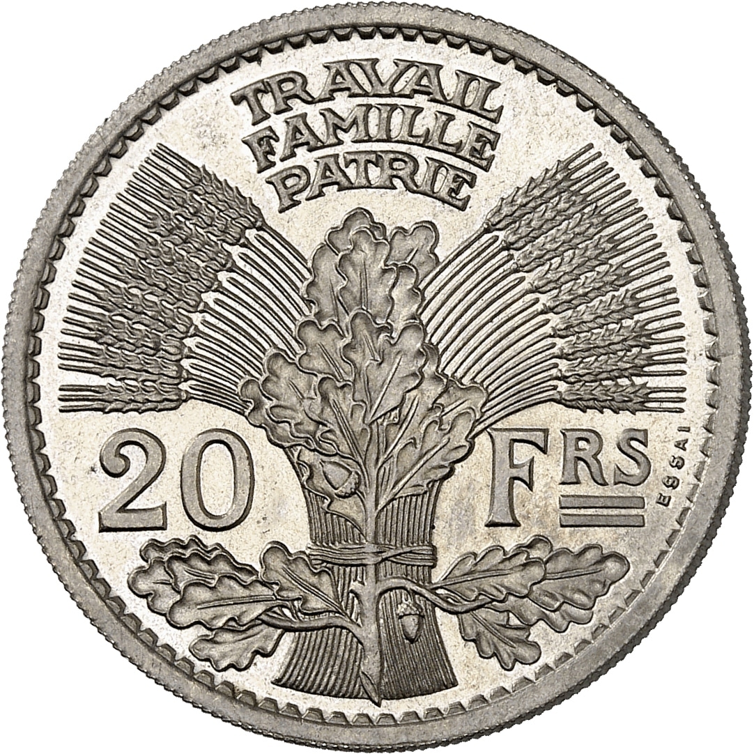 Rv. TRAVAIL/ FAMILLE/ PATRIE. Au centre, une large gerbe d’épis devancée d’une branche de chêne, accostée de 20 - FRS ; ESSAI à droite.