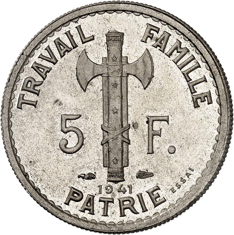 Rv. TRAVAIL FAMILLE PATRIE. Bâton de maréchal noué avec deux francisques, accosté de 5 - F et des (différents) ; au-dessous (date) ; ESSAI à droite.