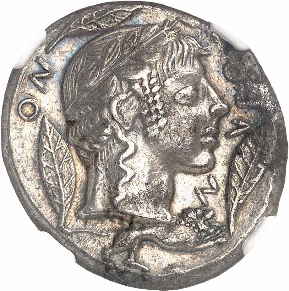 En 496 av. J.-C. Léontini est conquise par Hippocrate, le tyran de Géla et conservée sous son successeur Gélon Ier. ce dernier remporte une grande victoire sur la vaste armée punique d’Hamilcar en 480 av. J.-C. Les carthaginois durent payer 2000 talents d’argent d’indemnité, qui permirent de frapper de grandes quantités de monnaies. L’influence de Syracuse est évidente sur notre tétradrachme de Léontini, qui a été attribué à un graveur anonyme de Syracuse, connu sous le nom de “maître du Demareteion” ou au moins à son école. La série tire son nom de la reine Démarete de Syracuse, épouse du tyran Gélon, qui aurait été personnellement impliquée dans la défense des Carthaginois vaincus dans leurs négociations de paix après la bataille d'Himère en 479 av. J.-C. (Diodore de Sicile, XI.26.3). En échange, ils lui ont offert une couronne d'or, à partir de laquelle une pièce d'or a été frappée et appelée Demareteion. Pour R. Ross Holloway, “Le Lion de Damarete”, ANSMN XI, pp. 1-11, les œuvres de Syracuse et de Léontini sont de la même main, mais Carmen Arnold-Biucchi, dans son travail sur le trésor de Randazzo, voit plutôt une influence du maître, mais pas son travail [la pièce de Léontini étant de quelques années plus tard et dans un style réaliste plus développé]. L'avers avec le quadrige lent est directement emprunté aux tétradrachmes et décadrachmes syracusains tandis que la tête d'Apollon au revers reprend les traits de la tête d'Aréthuse, entourée de quatre dauphins, tandis que la tête d'Apollon est entourée de trois feuilles de laurier et d'un lion, ce dernier, leon en grec, servait d'emblème pour la ville Découvrir cette pièce en vidéo * Following Council Directive (EU) 2022/542 of April 5, 2022, implemented in national law from 01/01/2025, buyers from within the EU have to pay 5.5% VAT on the hammer price of this lot. * Suite à la Directive (UE) 2022/542 du Conseil du 5 avril 2022, mise en application dans le droit national à compter du 01/01/2025, l’adjudicataire européen devra également payer une TVA de 5,5% sur ce lot