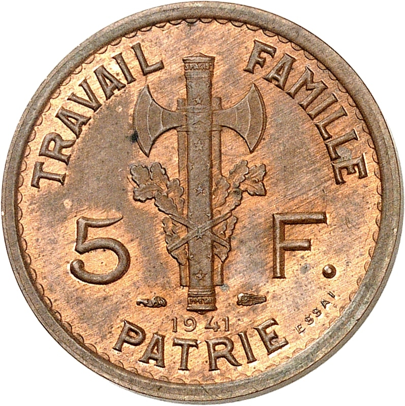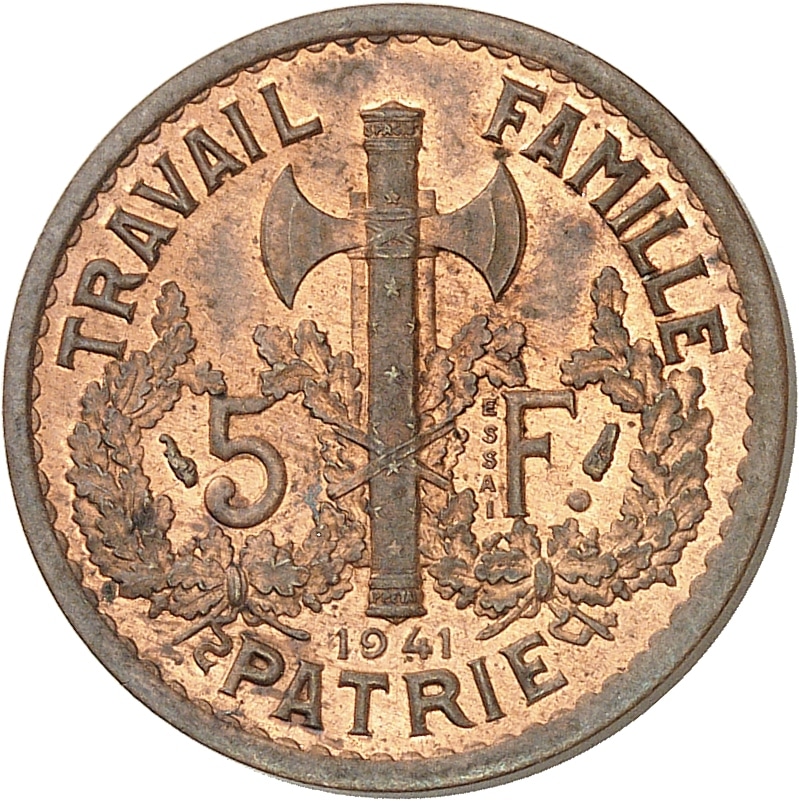 - État Français (1940-1944). Essai hybride au double revers de 5 francs Pétain, 1er type et 2e type, en cuivre, tranche lisse, Frappe spéciale (SP) 1941, Paris.