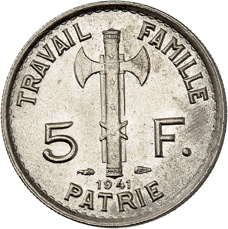 - État Français (1940-1944). 5 francs Pétain 1941, Paris.