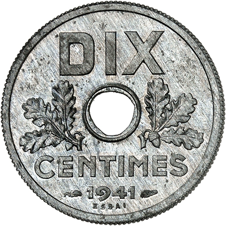 - État Français (1940-1944). Essai de DIX centimes, grand module, Frappe spéciale (SP) 1941, Paris.
