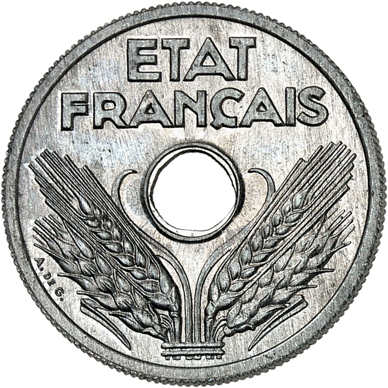 Av. ETAT / FRANÇAIS. Au-dessous du trou central, quatre épis de blés maintenus par une bague ; signature A. DE G.