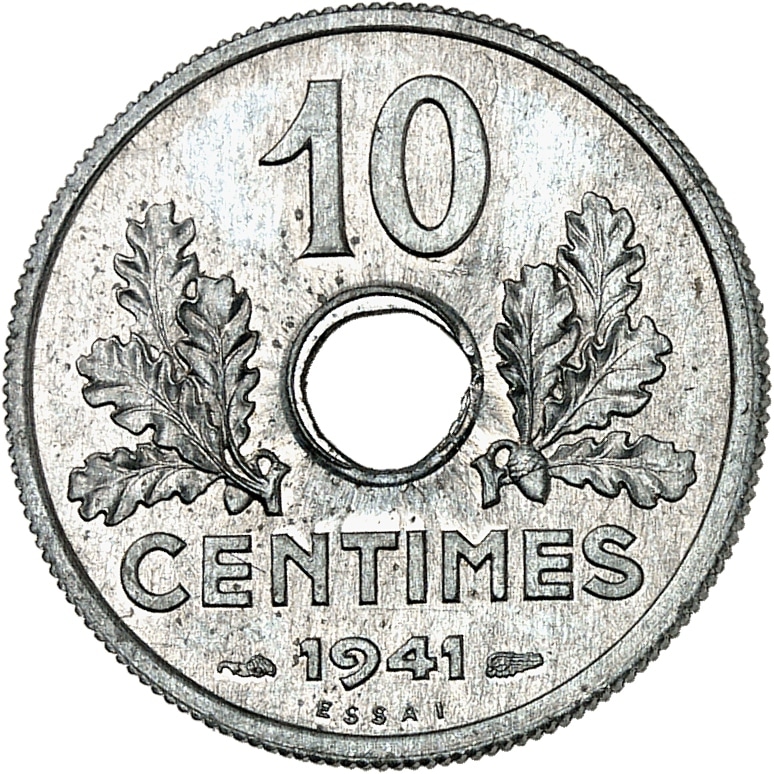 - État Français (1940-1944). Essai de 10 centimes État français, grand module, en zinc, Frappe spéciale (SP) 1941, Paris.
