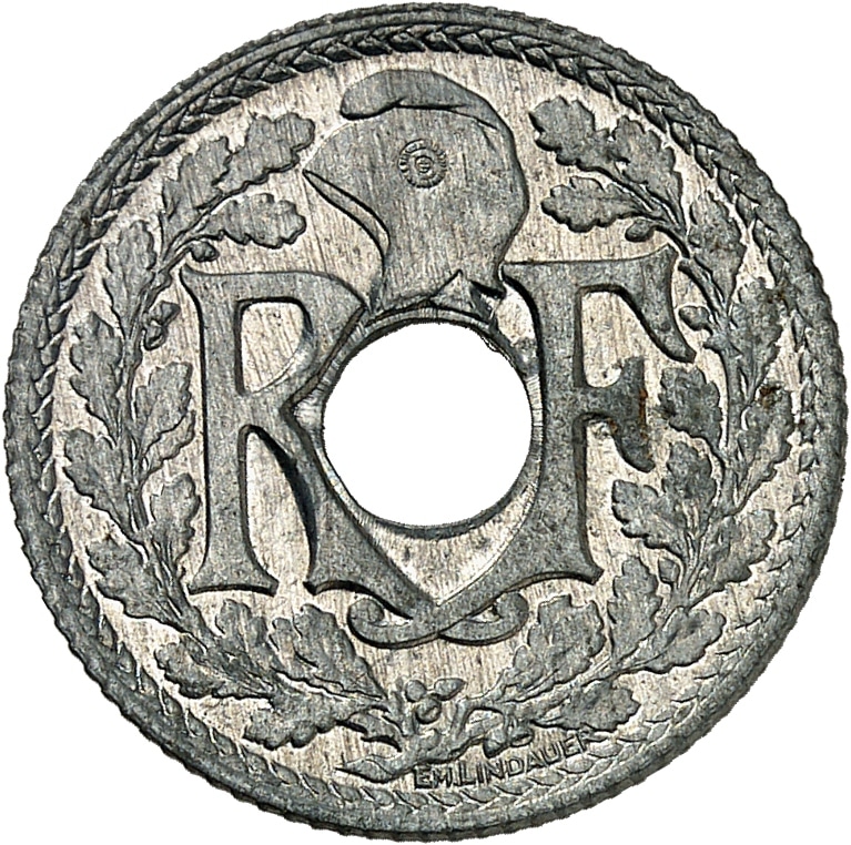 Av. RF autour du trou central surmonté d’un bonnet phrygien, le tout dans une couronne formée de deux branches, signature EM. LINDAUER.