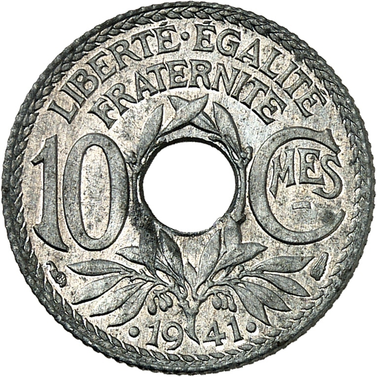 - État Français (1940-1944). 10 centimes Lindauer, avec points et Cmes souligné 1941, Paris.