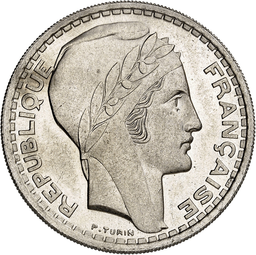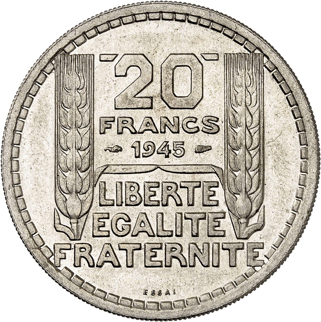 - Gouvernement provisoire de la République française (1944-1946). Essai de 20 francs Turin, grosse tête et rameaux courts, Frappe spéciale (SP) 1945, Paris.